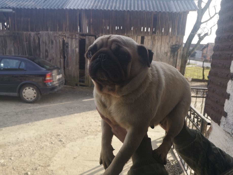 Na prodaju ženka mopsa starosti 3 god. Cijepljena i čipirana, naučena na djecu.
