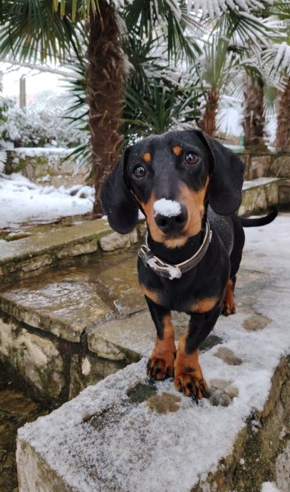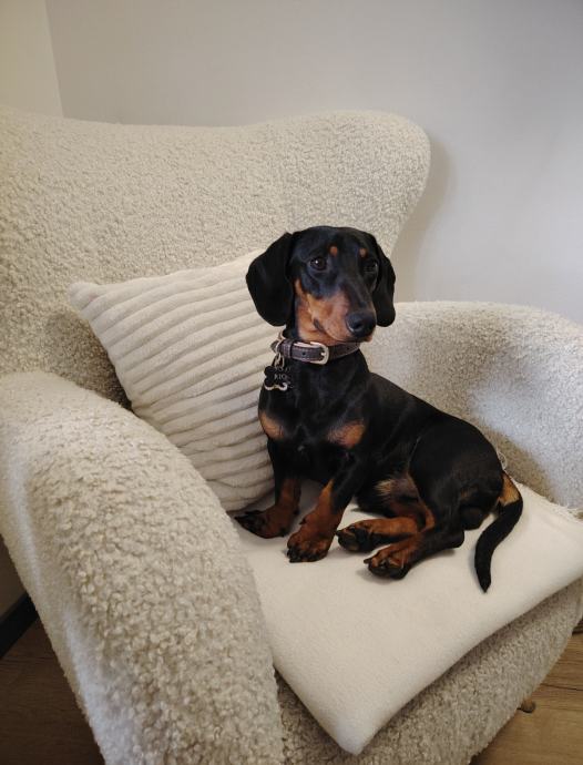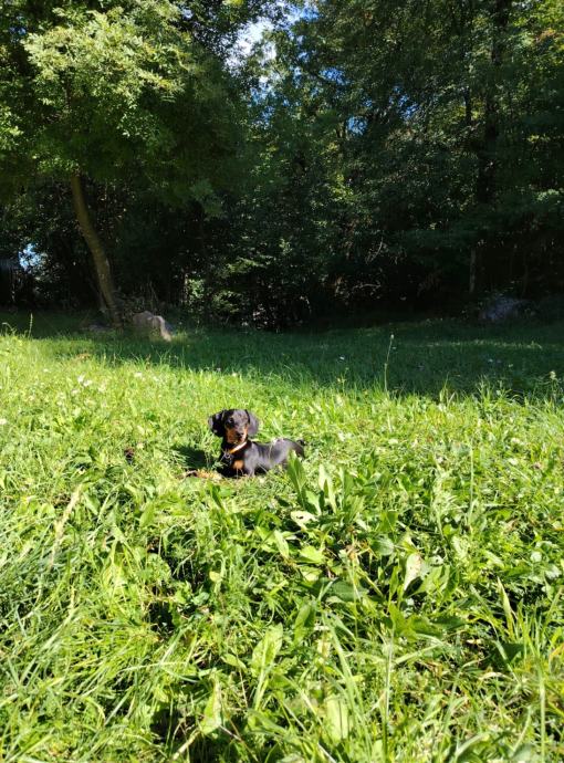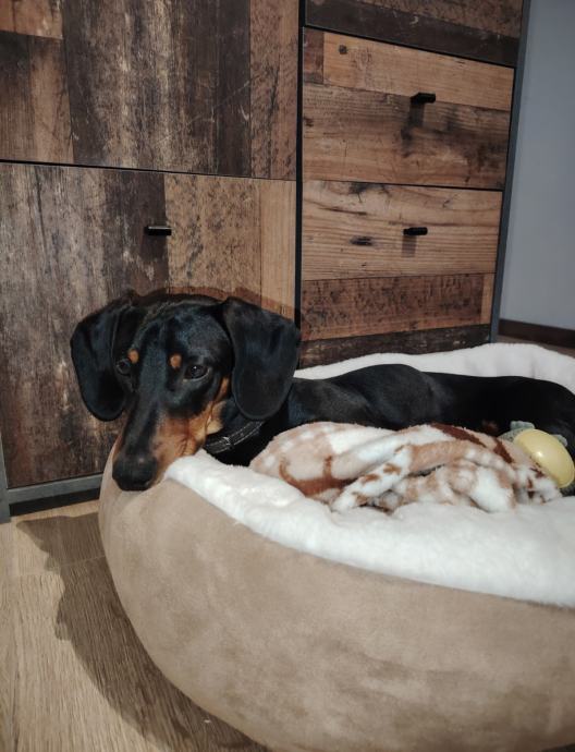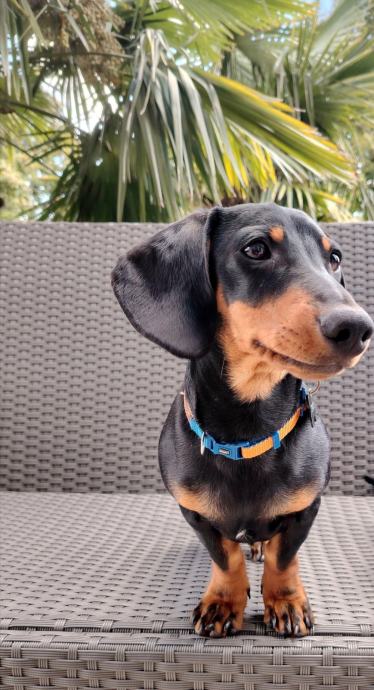 Pas je patuljasti jazavčar, mužjak, crn sa smeđim paležom, star 9 mjeseci. Divan, pametan, maza, miran. Navikao na druženja, šetnje, odrasle, djecu. Socijaliziran s drugim psima.