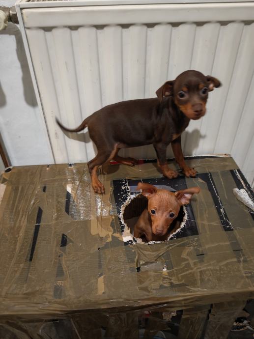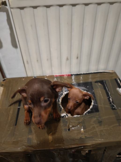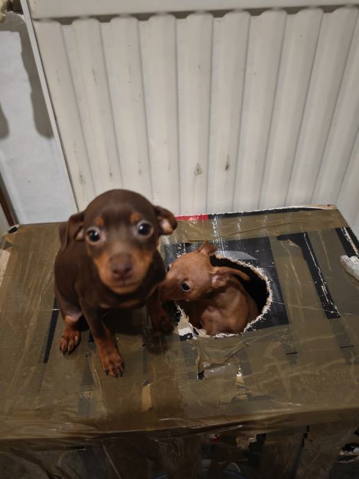 Prodajem psice patuljastog pinca starosti 3 mj, 2 cure smeda i cokoladna,biti ce teske oko 2.5 kg cijepljenje i mikrocipirane sa Eu putovnicom. Lokacija Garesnica
