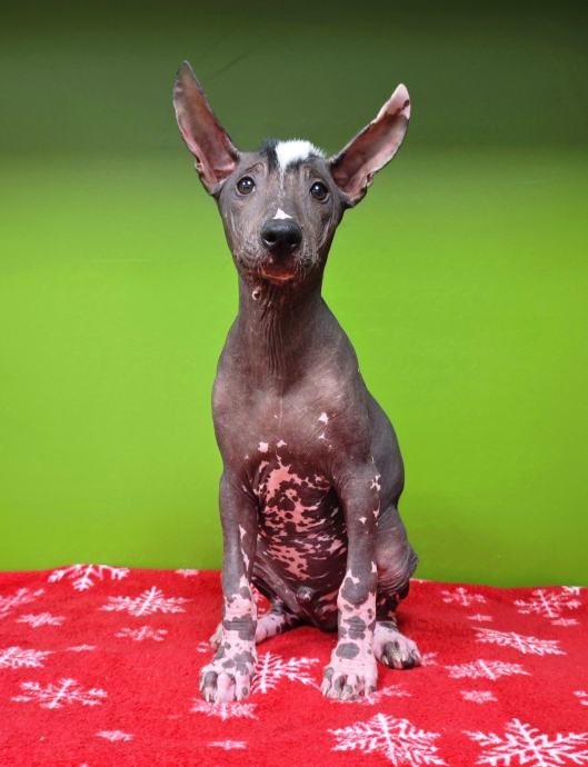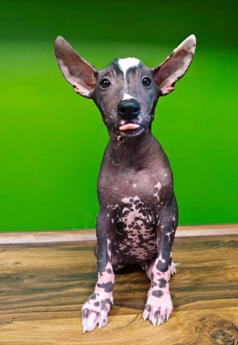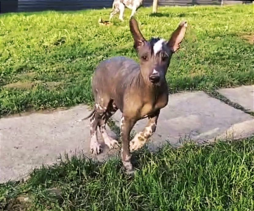 Štene je izrazito atraktivno obojeno, crno s bijelim zockicama i crno-bijelom kratkom irokezom.