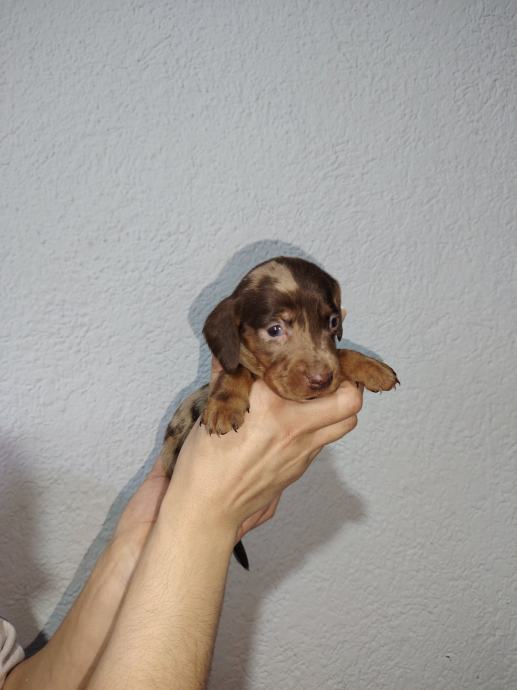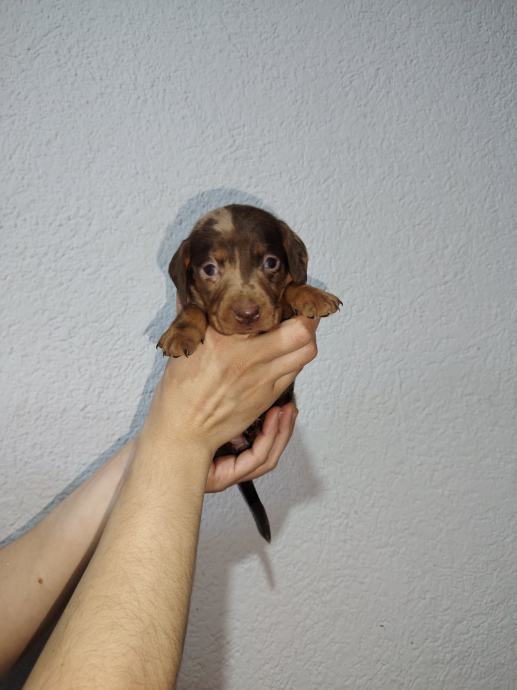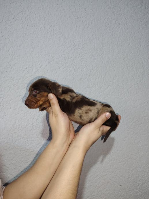 jazavčarka patuljasta choco merle ženkica. Dostupni će biti iza 15.siječnja 2026. cijepljena. Više puta očišćeni od parazita te sa svom dokumentacijom Eu pasport i cip koji se prenosi na vas što dodatno košta 35 euro.