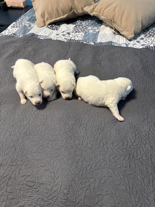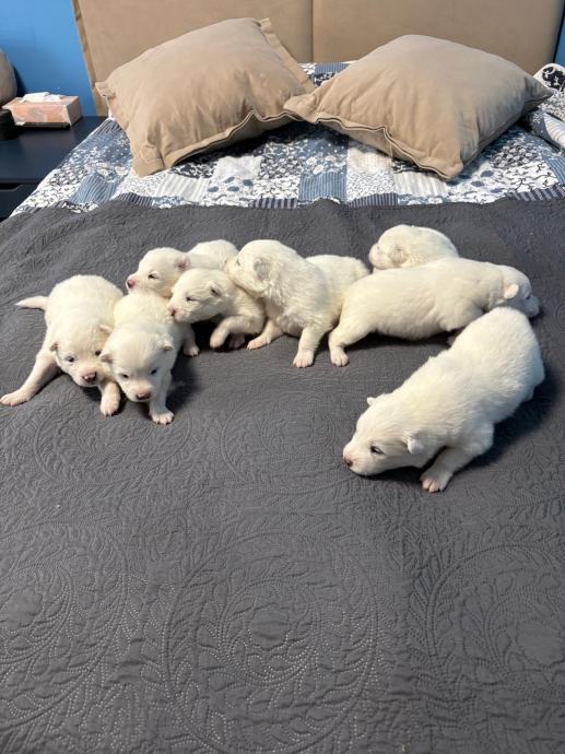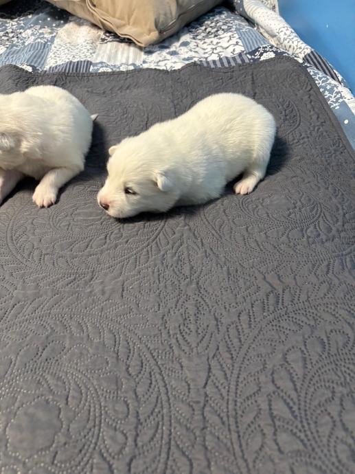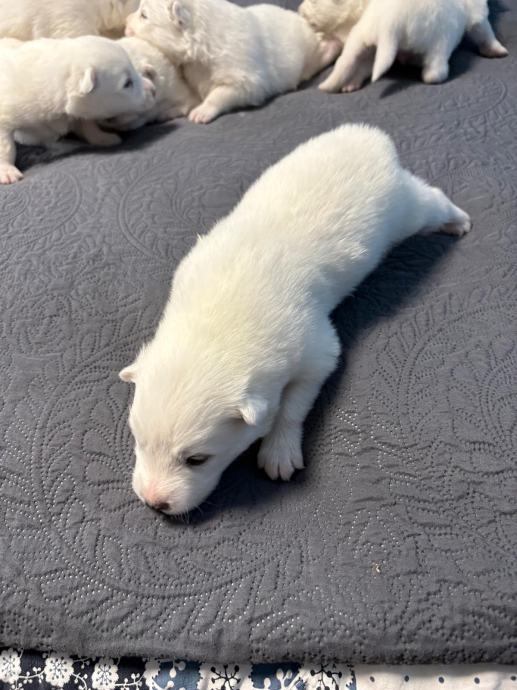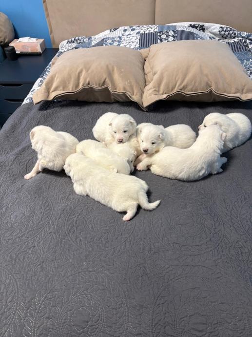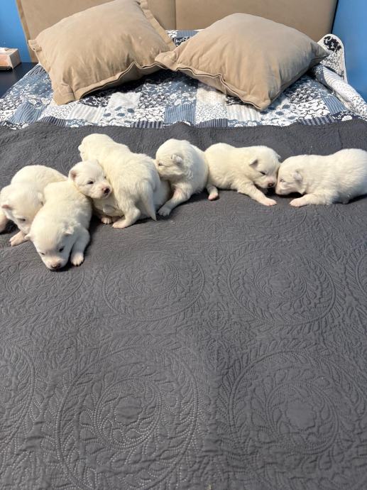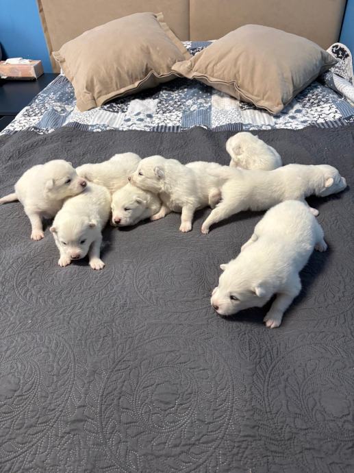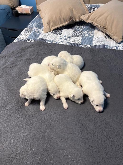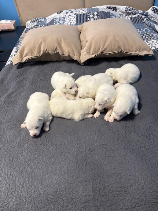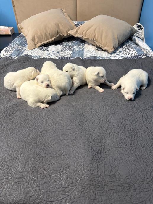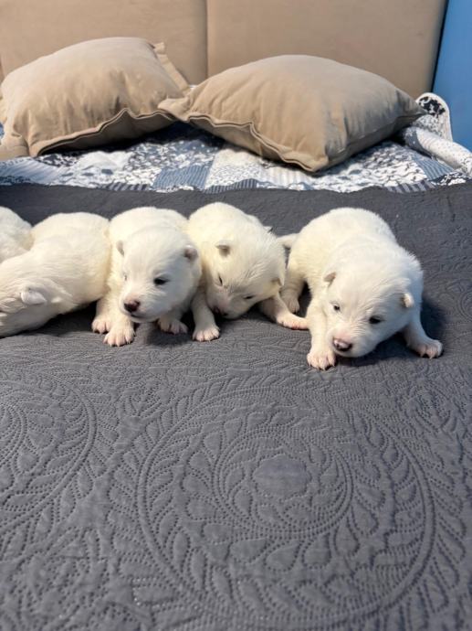 Samojed štenci, čistokrvni, 5 mužjaka i 3 ženka, oštenjeni 16. 1. 2026.. Roditelji prisutni. Cijena je 300 eura u što je uključeno čišćenje od parazita, cijepljenje, čipiranje i putovnica. Spremni za preuzimanje početkom 3. mjeseca.