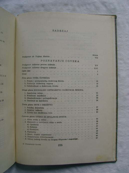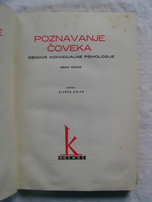 Alfred Adler - Poznavanje čoveka; Osnove individualne psihologije - drugo izdanje, izdavač Kosmos, Beograd 1958. godine, 17 x 24 cm, tvrdi uvez, 227 stranica.