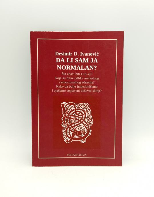 Desimir D. Ivanović: Da li sam ja normalan?Šta znači biti O.K-ej?Koje su bitne odlike mentalnog i emocionalnog zdravlja?Kako da bolje funkcionišemo i ojačamo sopstveni društveni sklop?Svjetski poznati majstor kliringa, inicirani sljedbenik legendarnog Charles Bernera, izlaže suptilne tehnike psihomentalne discipline. U nekoliko praktičnih koraka proči ćete kroz labirint svoje duše. Izuzetno!Stranica: 155Dimenzije: 13x20Jezik: BeogradPismo: LatinicaStanje: Nova knjigaUvez: MekiGodina: 2016