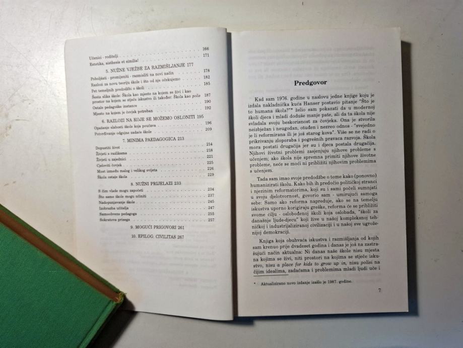 Autora zaokuplja pitanje kako humanizirati školu. Odgovor nalazi u stalnom korigiranju pogrešaka: tek tako će se reforma školstva približiti svojem cilju: "oslobođenoj školi koja oslobađa", "školi za današnje ljude-djecu" koji žive u našoj kompleksnoj tehničkoj i industrijaliziranoj civilizaciji i sve ugroženijoj demokraciji. Svoja zapažanja autor izvodi iz temeljne analize njemačkog društva i tamošnjeg sustava školstva. Hartmut von Hentig profesor je pedagogije na Sveučilištu u tom mjestu i voditelj Ogledne škole u Bielefeldu. Jedan je od najboljih reformnih pedagoga u Njemačkoj.