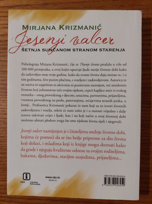 Naša priznata psihologinja Mirjana Krizmanić u knjizi „Jesenji valcer“ upućuje ljude starije životne dobi kako da zadovoljno nose svoje godine i svome životu daju smisao te da neovisno o svojoj dobi žive punim plućima, s veseljem i zadovoljstvom. Autorica to ne naziva ni uspješnim ni aktivnim ni pozitivnim starenjem, već smislenim životom koji jednostavno teče svojim tijekom, crpeći kapljice sreće iz svakog trenutka – onog provedenog s djecom, unucima, partnerima, prijateljima, vremena provedenog na poslu, putovanjima, tečajevima stranih jezika, u šetnji...