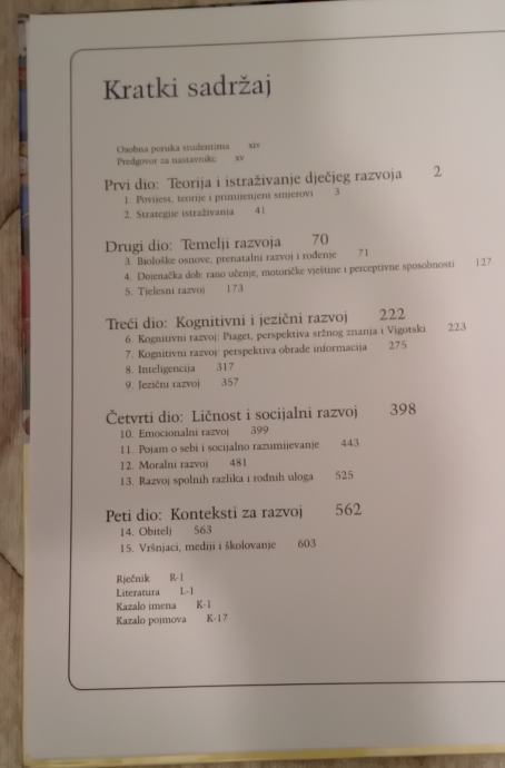 Knjiga sadrži 15 poglavlja podijeljenih u 5 dijelova. Sva poglavlja sadrže uvodni dio s pregledom tema koje se u pojedinom od njih obrađuju, sažetke koji zaključno naglašavaju najvažnije spoznaje iz poglavlja, te odjeljak Zapitajte se, kojim se kroz četiri vrste pitanja potiče na razmišljanje o dječjem razvoju.