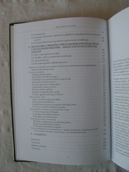 "Autorica je provela istraživanje o položaju i ulozi žena u 'kulturi i kulturnim industrijama'. Rad je podijeljen na dva djela. U prvom dijelu autorica obrađuje različite sociološke koncepcije društvene moći, i posebno, rodne teorije moći. U drugom dijelu knjige autorica provodi empirijsko istraživanje i nastoji prikazati sociološka obilježja upravljačkih položaja žena u kulturnom sektoru. Analiziraju se statistički pokazatelji o spolno/rodnoj upravljačkoj strukturi kulturnog sektora u Republici Hrvatskoj kao i odabrane komparacije sa zemljama EU-a, te se analizaju intervjui sa 45 ispitanica zaposlenih na upravljačkim mjestima u kulturnom sektoru."