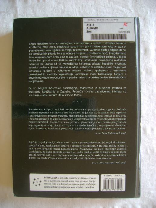 Mirjana Adamović - Žene i društvena moć - izdavači Plejada i Institut za društvena istraživanja, Zagreb 2011. godine, 18 x 25 cm, tvrdi uvez, 271 stranica.