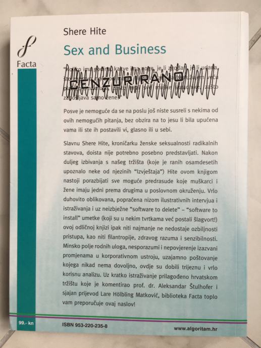 Slavnu Shere Hite, kronićarku ženske seksualnosti doista nije potrebno posebno predstavljati Hite ovom knjigom nastoji porazbijati sve moguće predrasude koje muškarci i žene imaju jedni prema drugima u poslovnom okruženju. Vrlo duhovito oblikovana, popraćena nizom ilustrativnih intervjua i istraživanja i uz neizbježne "software to delete" - "software to install" umetke (koji su u nekim tvrtkama već postali šlagvort!) ovoj odličnoj knjizi ipak niti najmanje ne nedostaje ozbiljnosti pristupa, kao niti filantropije, zdravog razuma i senzibilnosti. Minsko polje rodnih uloga, nesporazumi i nepovjerenje izazvani promjenama u korporativnom ustroju, uzajamno poštovanje kojega nikad nema dovoljno, ovdje su dobili trijeznu i vrlo korisnu analizu.