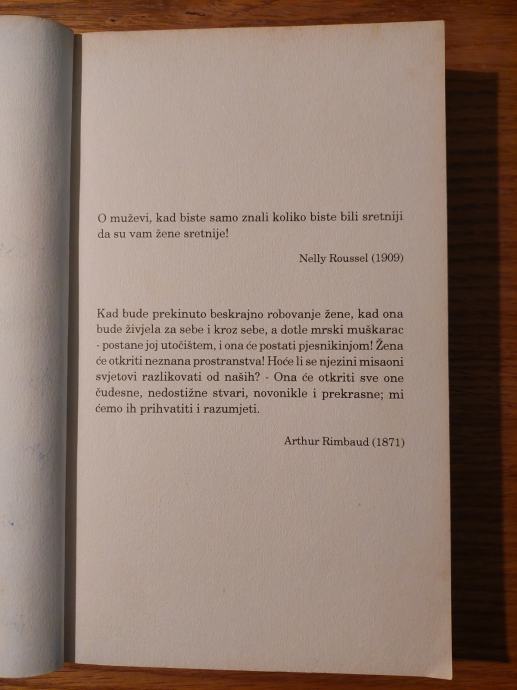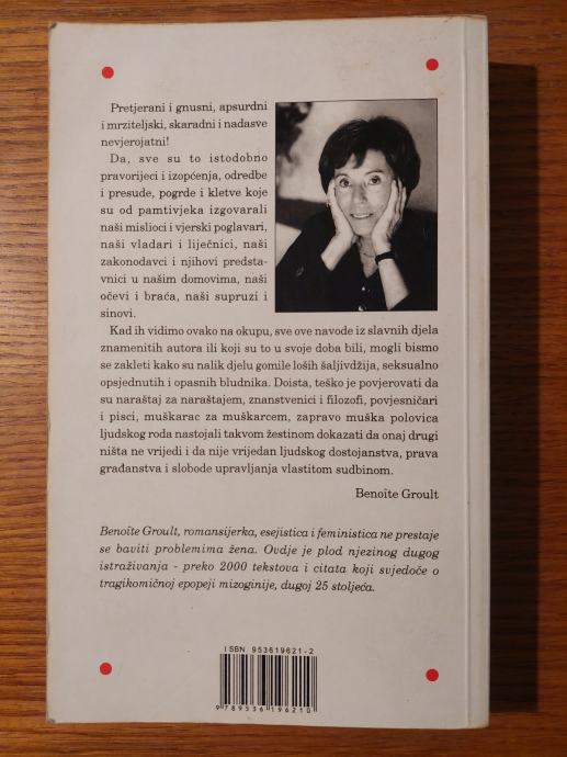 Što su sve o ženama izrekli starodrevni pisci, vjerski učitelji, filozofi i moralisti, liječnici i znanstvenici, odgojitelji, političari, pisci, povjesničari i novinari; što o njima kazuje narodna mudrost, a na kraju i neke od poznatih žena, francuska je spisateljica objedinila u ovoj knjizi. A ta mišljenja drugog spola pokazuju mizoginiju-mržnju prema ženama dugu preko dvije tisuće godina, koja, međutim, slikovito govori o karakteru samih muškaraca.