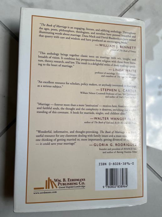 Couples spend an enormous amount of time and energy planning for the perfect wedding. But what about planning for the perfect marriage? In these times of rampant divorce and "relationship" crises, it makes sense to think seriously about the many challenges of married life that loom so large today. / The Book of Marriage offers a treasury of marital wisdom from across the ages. Intellectually engaging, morally responsible, and ideologically balanced, this anthology gathers some of the deepest, wittiest, and most edifying perspectives on the big questions of married life: Why get married at all? Can love last a lifetime? How do we handle money? Who's the boss? What about children? Conflict? Growing old? Illness and death? There is even a chapter on divorce - one calculated to save a few marriages.