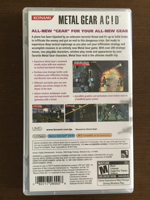 Metal Gear Acidメタルギア アシッド (Metaru Gia Ashiddo), stylized as METAL GEAR AC!D, is a turn-based collectible card[1] tactical RPG video game developed by Konami Computer Entertainment Japan for the PlayStation Portable. In 2016, a jumbo jet carrying Senator Hach, an important politician and likely future presidential candidate, is hijacked by terrorists. In exchange for the senator the terrorists demand from the United States government Pythagoras, a research project being conducted in the Moloni Republic in southern Africa. In efforts to identify these terrorists, the government begins an investigation of Pythagoras. The Moloni government refuses to cooperate and work with the United States, saying that it doesn't want to interfere in its current affairs. In response, the US sends in a covert special forces team to investigate, but the team is obliterated by armed resistance. With no other options and time running out, the US government calls Solid Snake to infiltrate the laboratory, discover the nature of Pythagoras, and to rescue Senator Hach.