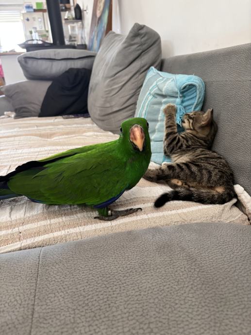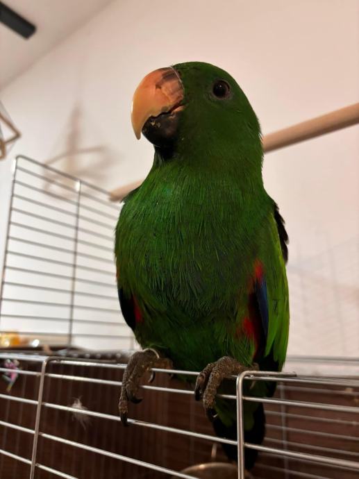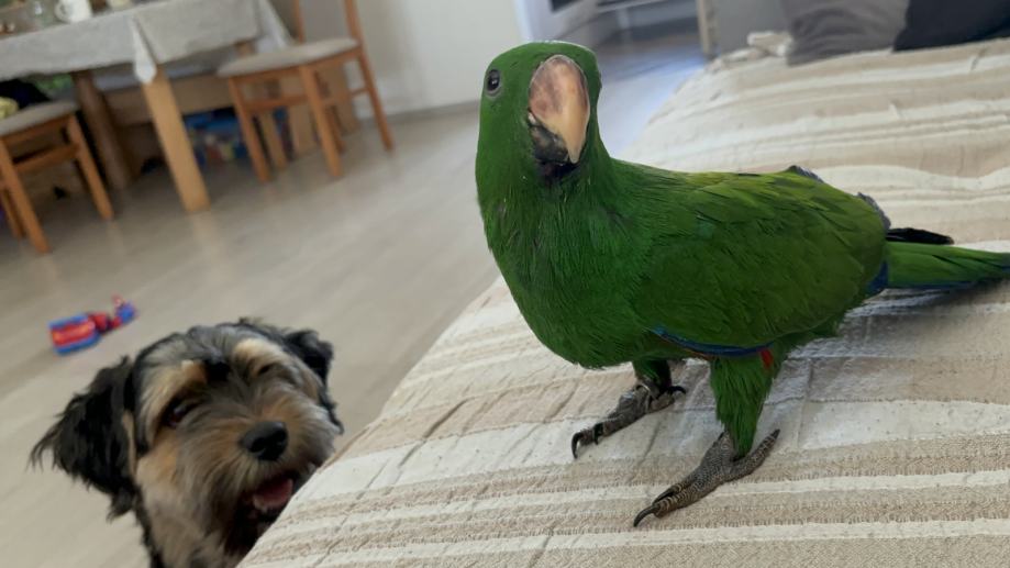 Papiga je izrazito vokabularno nadarena i krešti jer je još mlad. Papiga je i papige krešte dok ne sazriju i dok ne uhvate tempo suživota,sa papigom treba raditi i uložiti vrijeme u njihovu dresuru ukoliko će biti vas ljubimac.