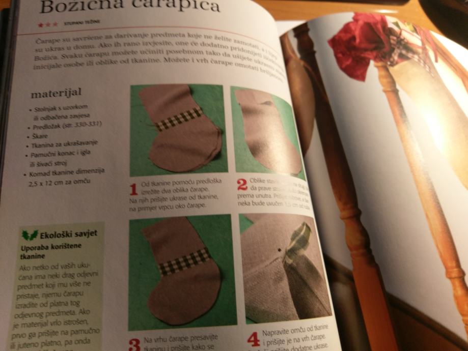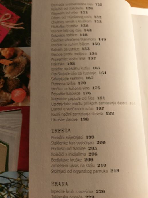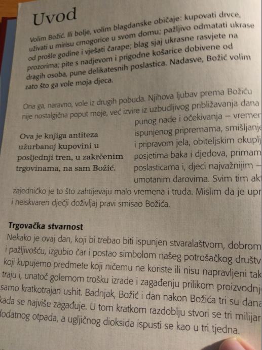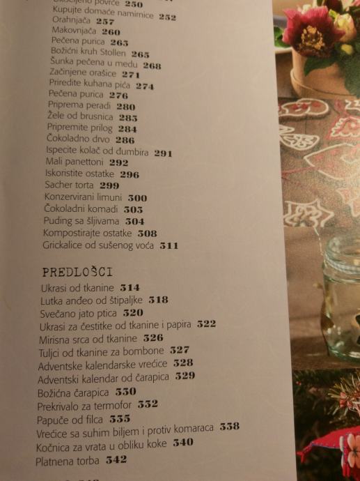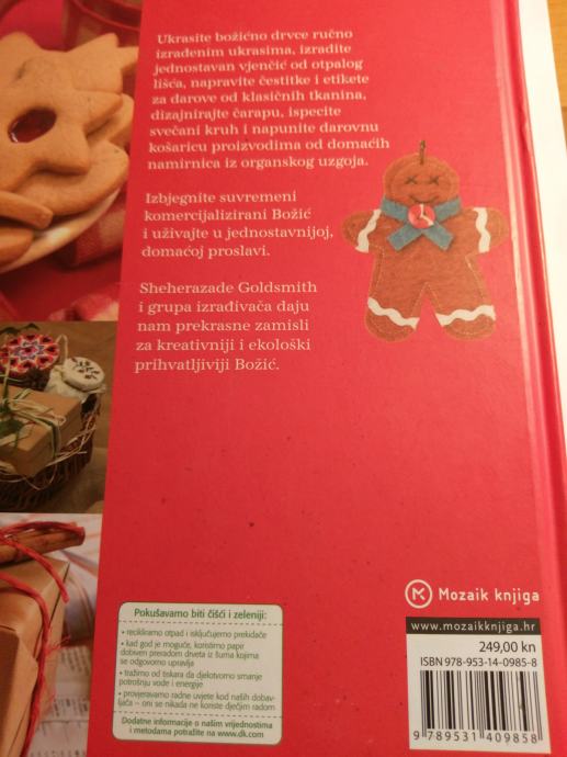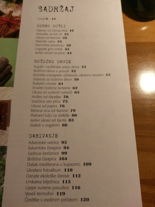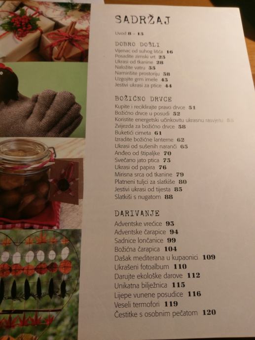 Knjiga opisuje kako tijekom Božićnih blagdana ukrasiti dom, izraditi darove, zamotati ih i pripremiti blagdansku trpezu, a da pritom proizvedemo što manje otpada i provedemo što manje vremena u trgovačkim centrima. Autorica potiče čitatelja da sam izradi ukrase, darove i ukrasni omot za darove i to, po mogućnosti, od iskorištenog materijala u vlastitom kućanstvu. Knjiga jer podijeljena u sljedeća poglavlja: DOBRO DOŠLI (u ovom poglavlju daju se savjeti kako u svome domu, od onoga što već imamo kod kuće, stvoriti ugođaj dobrodošlice), BOŽIĆNO DRVCE (kako i od čega izraditi ukrase za drvce), DARIVANJE (što darivati, kako izraditi darove i kako ih zamotati), TRPEZA (kako i čime ukrasiti blagdansku trpezu), HRANA (poglavlje daje recepte za tradicionalna domaća i strana blagdanska jela), PREDLOŠCI (knjiga sadrži predloške za izradu blagdanskih ukrasa i darova).