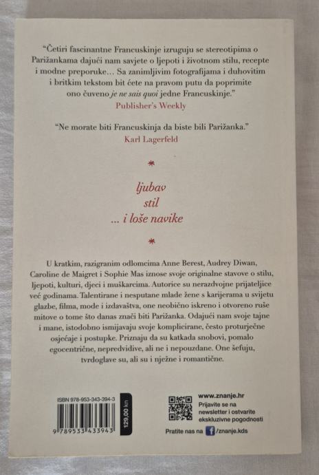 U knjizi Kako biti Parižanka u svakoj prilici četiri autorice kroz kratke, duhovite i iskrene tekstove govore o stilu, ljepoti, kulturi, odnosima i svakodnevnom životu. Ruše mitove o savršenoj Parižanki i s puno humora prikazuju njezine mane, proturječnosti i snagu.