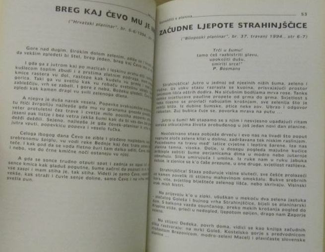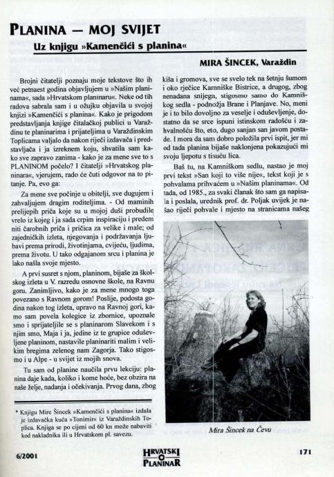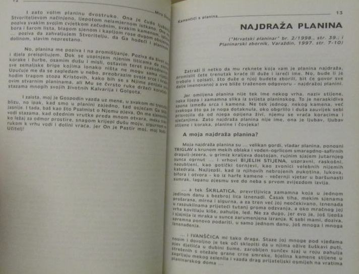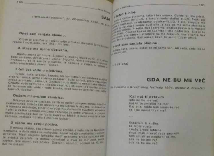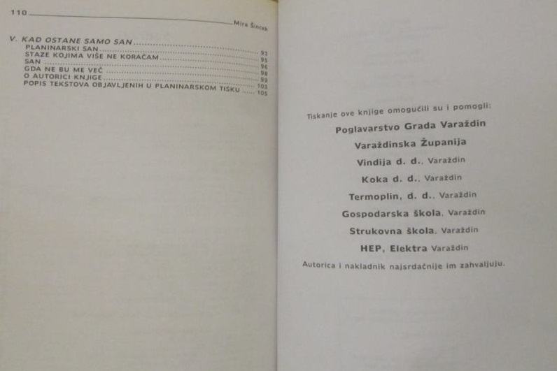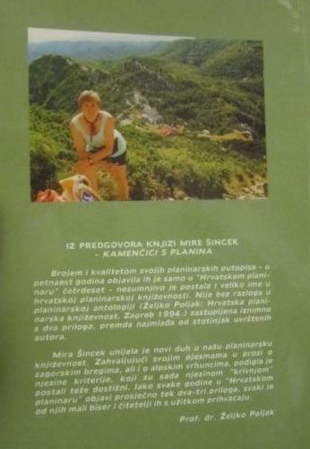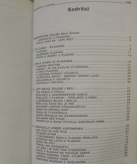 Trajno nadahnuće prirodom i planinom Mire Šincek izraslo je u četrdesetak tekstova, unoseći tako novi duh u hrvatsku planinarsku književnost. Objavljivani u "Hrvatskom planinaru" u proteklih petnaestak godina članci su po prvi puta objedinjeni u ovoj zbirci. Raspoređeni su u pet tematskih cjelina: "To čudo planina", "Mila kuda si planina", "Lepi bregi zeleni i beli", "Dragulj usred uspomena" i "Kad ostane samo san" predstavljaju reprezentativan izbor planinarskih putopisa.
