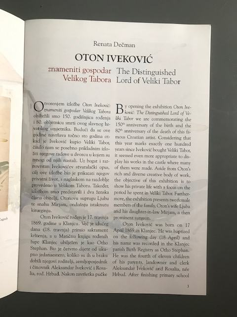 Katalog izložbe kojom se obilježila 150. godišnjica rođenja i 80. obljetnica smrti hrvatskog slikara Otona Ivekovića. Izložbom je predstavljeno tridesetak njegovih slika i crteža te reprodukcije privatnih dokumenata i pisama. Poseban naglasak stavljen je na razdoblje njegova života u dvorcu Veliki Tabor, kojeg je kupio 1919. godine i u njemu boravio 16 godina te na dvije žene u obitelji – suprugu Ljubu, koja se zalagala za poboljšanje položaja žena u društvu i snahu Mirjam, uglednu hrvatsku liječnicu.