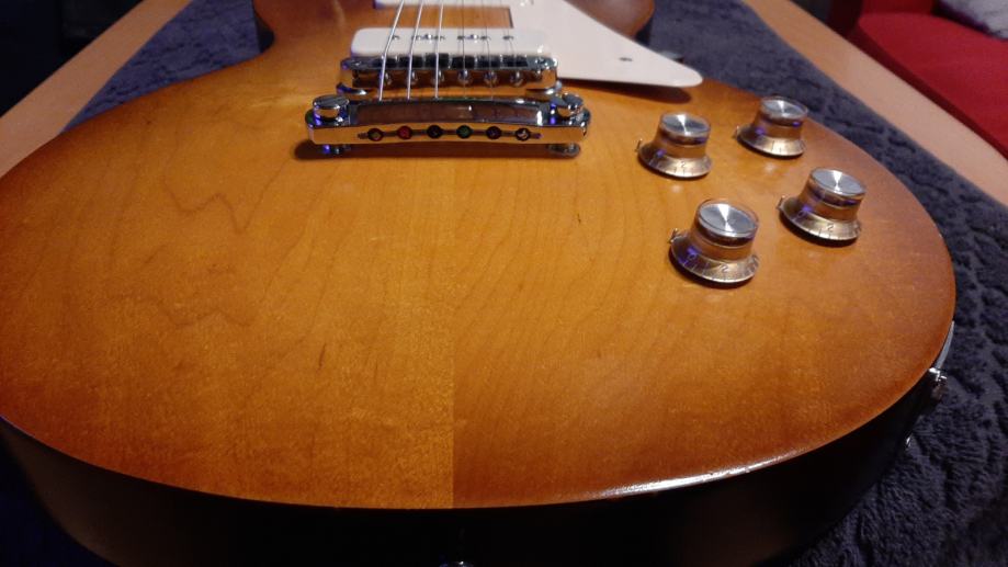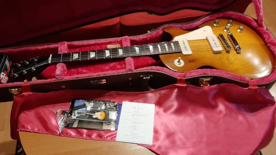 Satin Honeyburst boja, na gitaru stavljen metalni jack plate (skinut plastični), Schaller strap lock, CTS potovi , bolji kondezatori, Q pickups P-90s , 50s les paul wiring.