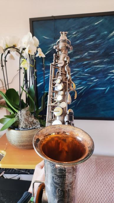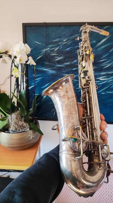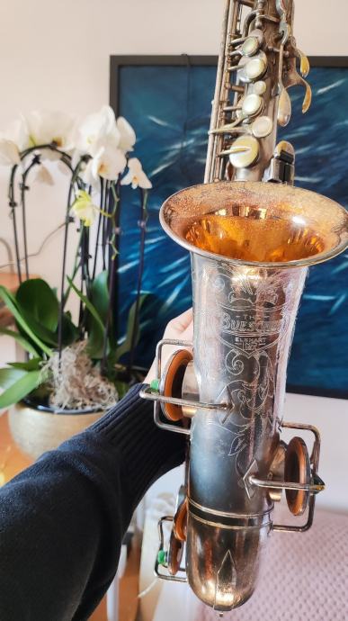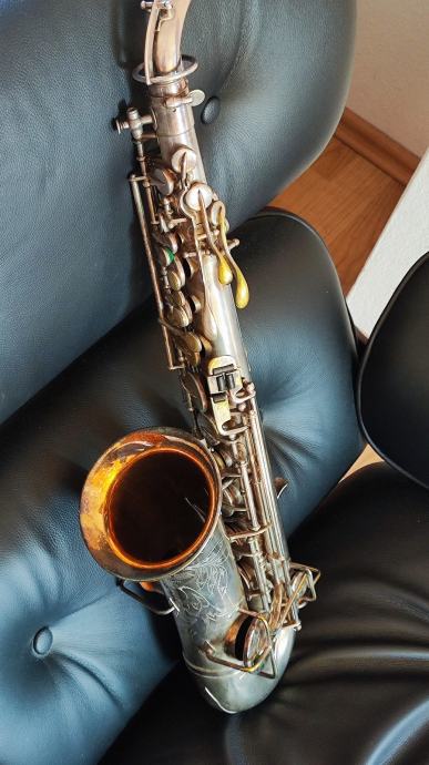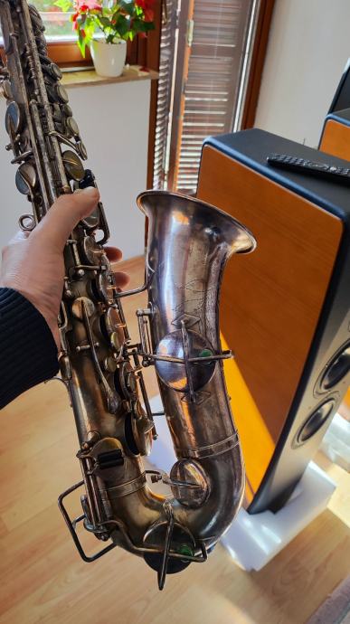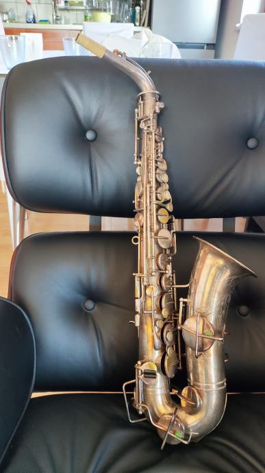 Stanje: Saksofon je u izvornom stanju, bez grubih popravaka, s jasno vidljivom gravurom koja svjedoči o kvaliteti izrade iz 1920-ih.