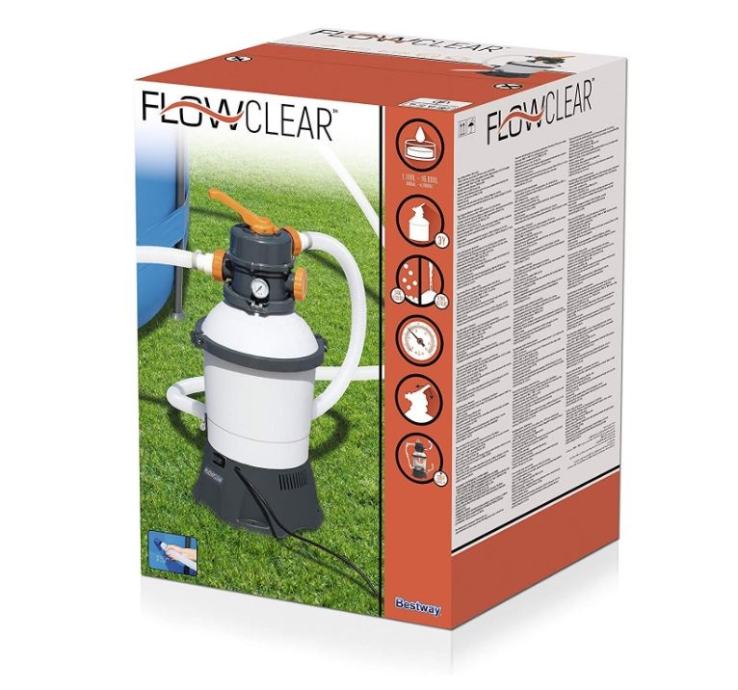 Pješčana filtar pumpa za bazen protoka 3.028 l/h. Odgovara bazenima kapaciteta 1000-18.100 litara. Pumpa dolazi sa ugrađenim CemConnect dispenzerom u koji se ubaci tableta klora koja se zatim automatski postupno ispušta u vodu. Punjenje kvarcnim pijeskom granulacije 0.48-0.85 mm ( potrebna količina za jedno punjenje 8.5 kg ) ili Polysphere ispunom ( potrebno 240g )