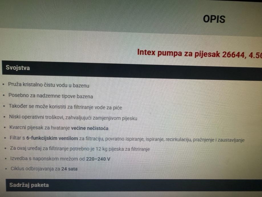 Prodajem Intex pumpu za pijesak, model 26644, s protokom vode od 4.500 l/h. Pumpa je namijenjena nadzemnim bazenima, a može se koristiti i za filtriranje vode za piće.