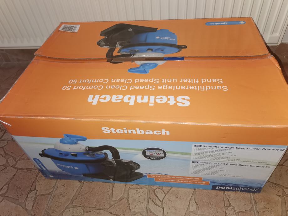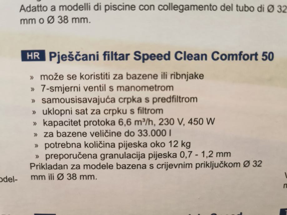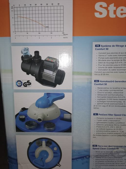 Prodajem pješčani filter Steinbach Speed Clean Comfort 50, sa protokom 6,6 m3/h, timer. Potpuno novi, nikad korišten, u originalnoj kutiji. Pogodan za bazene do 33 m3. Za promjer cijevi od 32 mm koje ima većina bazena s kartonskim filterom, odmah se lako makne pumpa s kartonskim filterom i postojeće cijevi spoje na pumpu, bez potrebe za kupovinom adaptera. Također i za promjer cijevi od 38 mm. Uz pumpu darujem 25 kg pijeska za filtraciju, ali onda ne šaljem poštom, već treba osobno doći po sve. Poštom šaljem samo pumpu. Moguće plaćanje pouzećem. U cijenu je već uključena dostava (paket 14.5 kg).