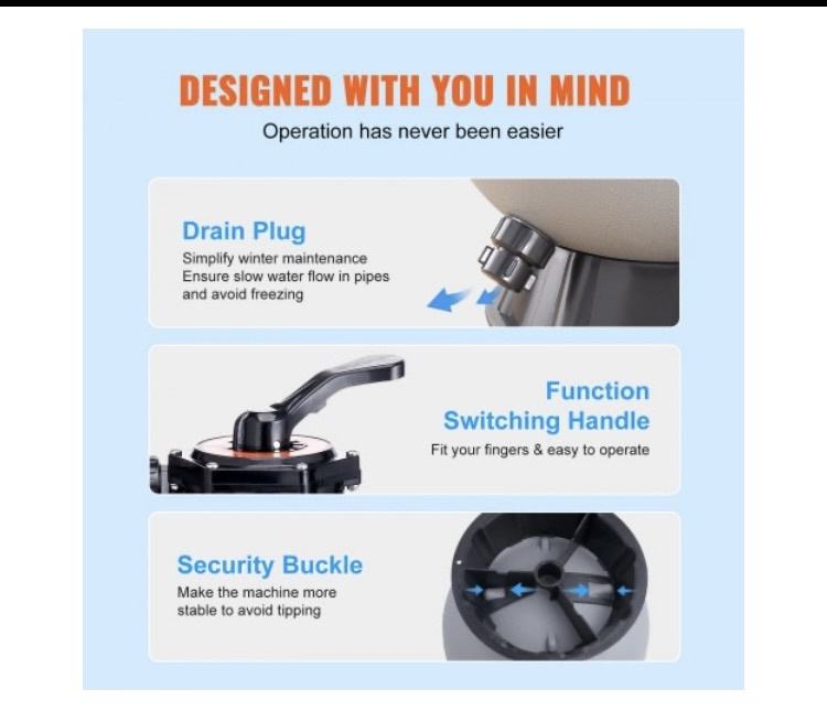 sa 7 različitih funkcija, održavanje nikada nije bilo lakše. Naš pješčani filtar za bazene u zemlji opremljen je nizom načina rada uključujući filtar, povratno ispiranje, ispiranje, recirkulaciju, otpad, zimski i zatvoreni način rada, dajući vam niz opcija za odabir. Za optimalnu izvedbu preporučujemo korištenje pijeska granulacije 20.