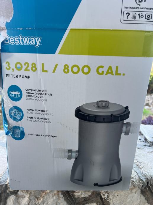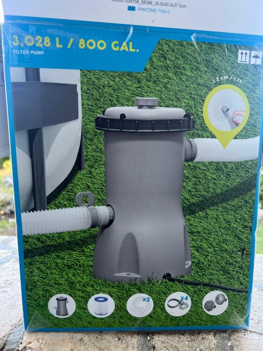 Pumpa je Bestway Flowclear 3.028 L/h (800 gal/h) model 58386 za nadzemne bazene.
