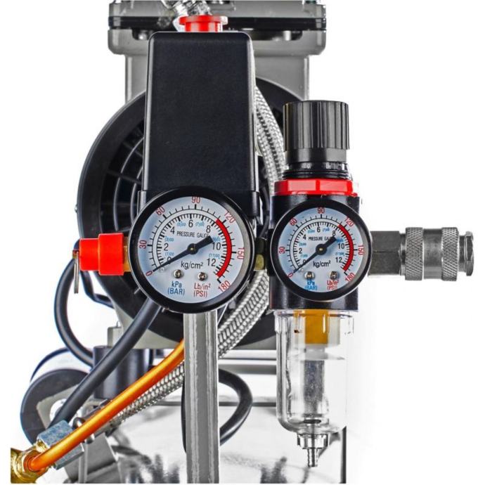 Udobna ručka, veliki transportni kotači i mala težina čine kompresor izuzetno mobilnim i jednostavnim za transport. Dizajn bez ulja eliminira potrebu za održavanjem sustava podmazivanja, dok jednostavno rukovanje i napajanje od 230 V omogućuju upotrebu gotovo bilo gdje. Dva lako čitljiva manometra, tihi način rada od 70 dB i zaštita od preopterećenja osiguravaju sigurnost i udobnost korištenja. Dodatni sifon za vodu s reduktorom tlaka omogućuje preciznu kontrolu zraka.