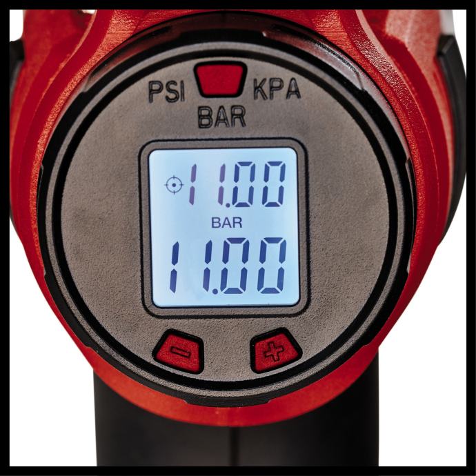 Einhell akumulatorski autokompresor CE-CC 18 Li-Solo posebno je lagan i praktičan kompresor koji je idealan za male poslove kao što je napuhavanje guma vozila, guma za bicikle ili lopti. Kao član visokokvalitetne Power-X-Change obitelji, ovaj aku automobilski kompresor može se kombinirati sa svakom baterijom iz sistema visokih performansi. Za brzo i jednostavno očitavanje trenutnih postavki, akumulatorski autokompresor ima digitalni prikaz tlaka. Postavljanje potrebnog tlaka na maksimalnu vrijednost od 11 bara vrlo je jednostavno. Nakon postizanja odabranog tlaka autokompresor se automatski isključuje. Možete birati između vrijednosti bar, psi i kpa jednostavnim pritiskom na gumb. Ručno napuhavanje moguće je u bilo kojem trenutku bez prethodnog odabira. Trodijelni set adaptera za napuhavanje može se pohraniti izravno na kompresor. Za veću udobnost tijekom korištenja tu je ergonomska ručka. Za fleksibilan doseg tu je crijevo za komprimirani zrak od 60 cm zajedno s ventilom za gumu. Ovaj proizvod dolazi bez baterije i punjača; ove stavke su dostupne odvojeno, npr. kao praktičan Power X-Change Starter Kit u različitim razredima snage.