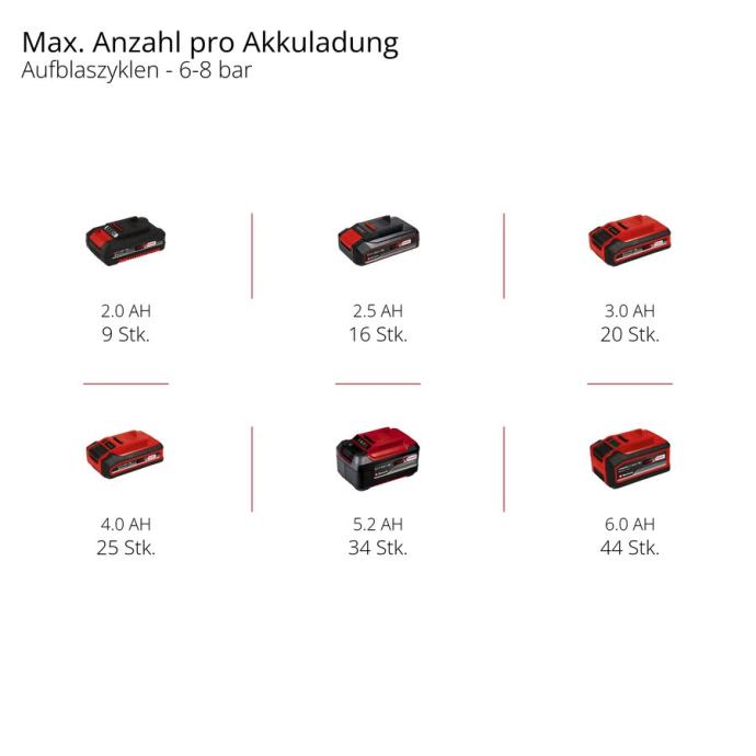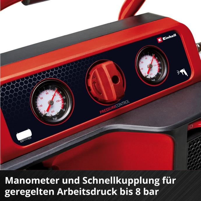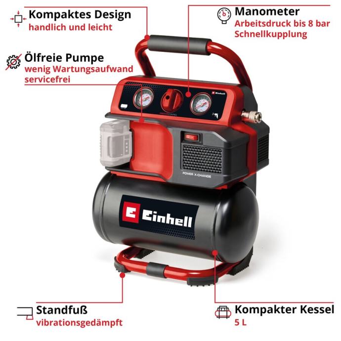 S Einhell akumulatorskim kompresorom TE-AC 18/75 Li OF-Solo zrak ne nestaje tako lako, bilo u radionici ili garaži. To osigurava mobilni i snažni kompresor na baterije sa spremnikom od 5 litara, maksimalnim radnim tlakom od 8 bara i usisnim kapacitetom od 75 litara u minuti. Napaja ga 18 V Power X-Change baterija. Pumpa je bez ulja i bez servisiranja, što troškove održavanja održava na najnižoj mogućoj razini. Za regulirani radni tlak dostupni su manometar i brza spojka, a za neregulirani tlak u spremniku još jedan manometar. Reduktor tlaka omogućuje vam ručno podešavanje željenog radnog tlaka. Mobilnost igra glavnu ulogu kod bežičnih uređaja, zbog čega ne možete bez integrirane ručke za nošenje. Sa svojim gumiranim nogama i prigušenim vibracijama, kompresor od 9,5 kg ima čvrsto postolje i gotovo ne stvara nikakve vibracije. Odvodni vijak služi za praktično održavanje i može se koristiti za ispuštanje kondenzirane vode. Isporuka ne uključuje bateriju ili punjač; dostupni su zasebno.