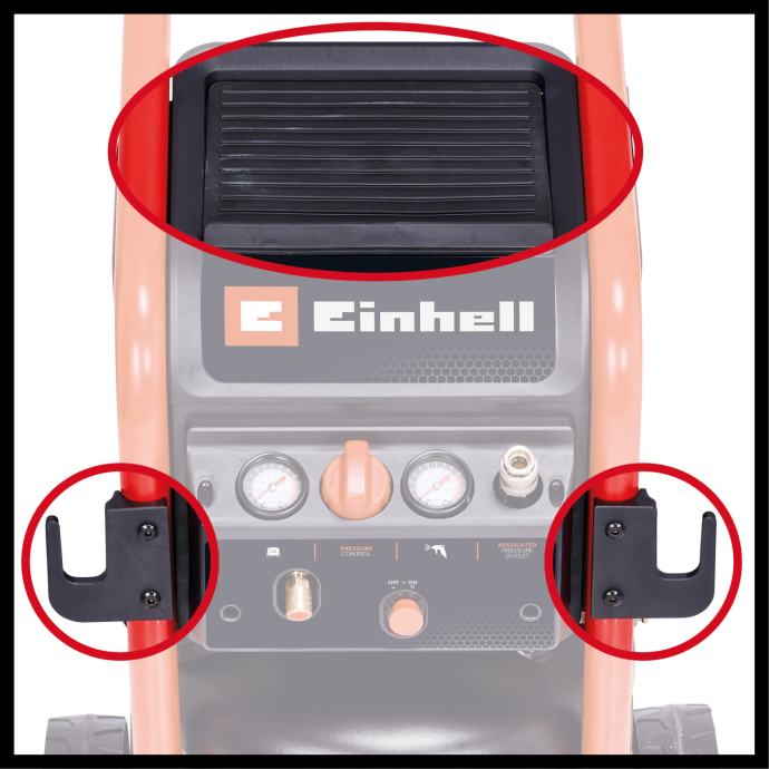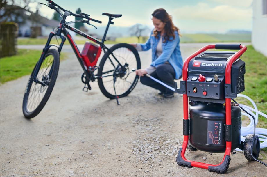 Einhell kompresor TE-AC 240/24 Silent praktičan je svestrani uređaj za različite primjene komprimiranog zraka. Sa snagom motora od 1.500 W, usisnom snagom do 240 l/min i spremnikom od 24 litre, kompaktni kompresor mora biti u svakoj garaži i radionici. Pomoću reduktora tlaka, tlak zraka se može regulirati do maksimalno 10 bara za različite primjene. Regulirani radni tlak i tlak iz spremnika mogu se očitati na odgovarajućem manometru. Alati na komprimirani zrak mogu se jednostavno spojiti pomoću brze spojnice. Tihi kompresor karakterizira niža razina buke od 71 dB (LpA vrijednost) u usporedbi s konvencionalnim kompresorima. Pumpa bez ulja, bez servisa i odvodni vijak za jednostavno pražnjenje vode koja se kondenzirala u spremniku osiguravaju malo održavanja. Kompaktan, okomiti dizajn omogućuje pohranjivanje kompresora radi uštede prostora. Mogućnost pohranjivanja kabela za napajanje integrirana je u uređaj. Kotači i ručka za nošenje olakšavaju transport kompresora.