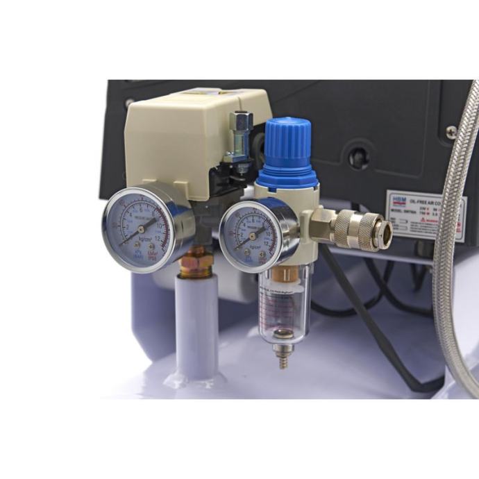 kompresor je standardno opremljen s dva manometra, zaštitom od nadtlaka, regulatorom tlaka, separatorom ulja, slavinom za vodu ispod tlačnog spremnika i brzom spojnicom