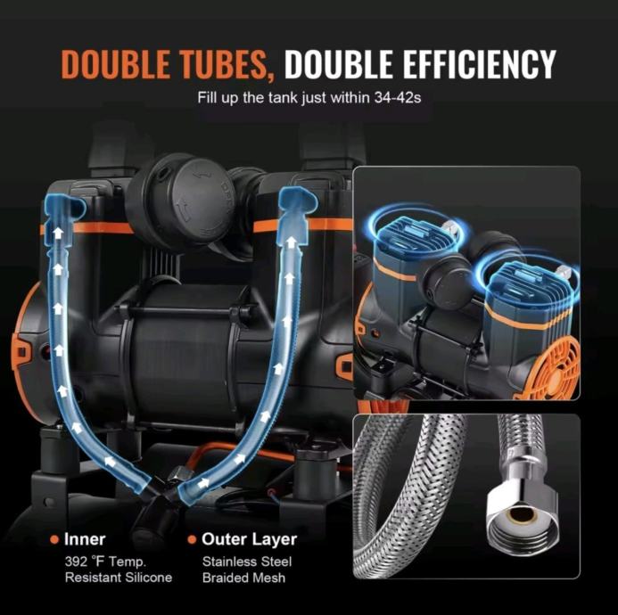 Brzo i učinkovito napuhavanje: S dvostrukim cijevima i dvostrukim cilindričnim sustavom usisa, ovaj kompresor zraka ubrzava proces napuhavanja, štedeći vam dragocjeno vrijeme. Usisna cijev, izrađena od silikona otpornog na visoke temperature i pletene mreže od nehrđajućeg čelika, nudi dvostruku zaštitu od oštećenja i korozije.