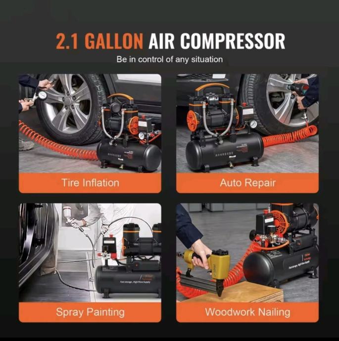Pokreće ga motor od 900 W bez ulja, ovaj kompresor isporučuje 2,2 CFM pri 90 PSI i brzinu do 2800 o/min. Dobro je prilagođen raznim pneumatskim alatima, uključujući pištolje za čavle, udarne ključeve, pištolje za prskanje i još mnogo toga, što ga čini idealnim za napuhavanje guma, popravak automobila, bojanje prskanjem i obradu drveta.