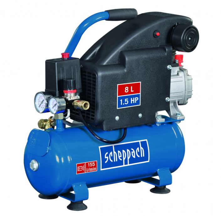 Scheppach HC 08 kompresor je kompaktan i lagan kompresor koji je izvrstan za kućnu upotrebu ili za korisnike kojima mala težina i lakoća rukovanja odgovara na poslu. Stroj ima moderan motor s dugim vijekom trajanja i minimalnim održavanjem. Jednostavno provjerite razinu ulja gledanjem optičkog pokazivača na stroju. Tlačna posuda služi kao dovod komprimiranog zraka i motor se uključuje samo ako se tlak zraka pada ispod potrebne razine. Možete ga pričvrstiti za spajalicu, zračni kist, pištolj za puhanje i druge zračne alate. Dodatna ručka omogućuje jednostavno rukovanje strojem.