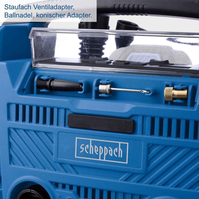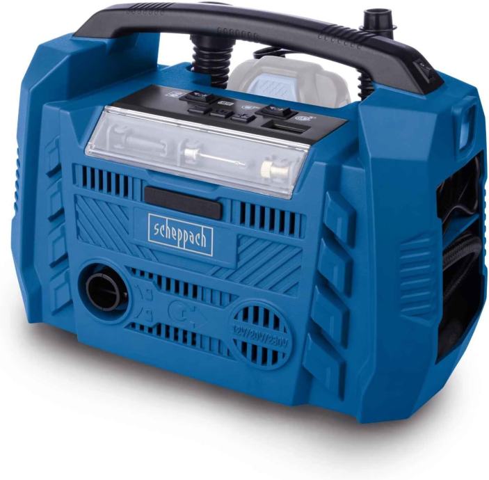 Airforce 6 ima tri ivora napajanja i njime se može upravljati preko kabla za napajanje, moćne baterije IXES od 20 volti i priključka od 12 volti. Maksimalni radni tlak od 10.3 bara se lako podešava pomoću providne kontrolne table. Opseg isporuke takođe uključuje adapter za ventil, kuglastu iglu, konusni adapter, crijevo visokog pritiska od 75 cm i crijevo za puhalicu od 44 cm. Kao dio Scheppach IXES 20-voltne serije, sve baterije i punjači iz serije sistema mogu se kombinovati sa hibridnim kompresorom. Baterija i punjač su dostupni zasebno.