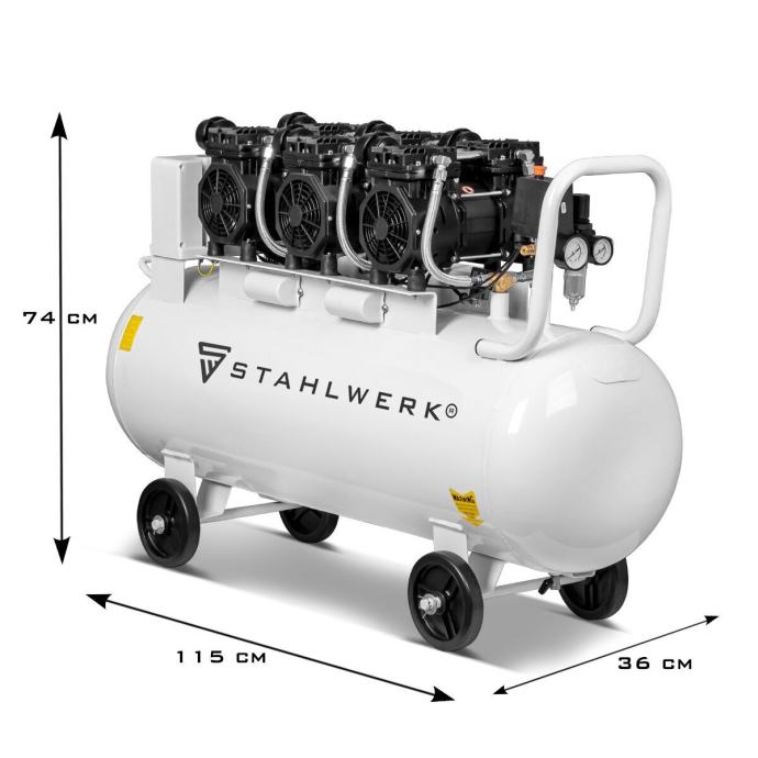 Vrlo lagana tlačna posuda za maksimalnu mobilnost! Težak samo 70 kg, može se transportirati bilo gdje. Lagani spremnik ima 100 litara i može se napuniti do kraja u tren oka. S maksimalnim izlaznim tlakom od 10 bara i maksimalnim protokom od 630 L/min, kompresor je prikladan za širok raspon primjena. Snažni kompresor za komprimirani zrak radi s nehabajućim i snažnim motorima bez četkica. Tri dvoklipna motora od 1,89 KS opskrbljuju kotao dovoljnom količinom zraka za postizanje maksimalne učinkovitosti. Motor je potpuno bez ulja. Sa samo 69 dB, kompresor ne stvara neugodnu pozadinsku buku. Dugotrajni sustav bez ulja enormno smanjuje održavanje i trošenje! Standardna brza spojka (nazivna širina 7,2 mm) omogućuje brzu izmjenu crijeva i raznih alata. Manometar pokazuje preostali tlak u spremniku.
