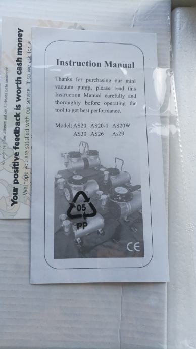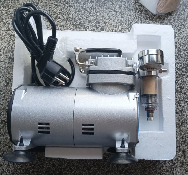 Mala laboratorijska vakuum pumpa, radi bez upotrebe ulja, 20-23 L/min. U originalnom pakiranju, s manometrom i cijevi, uz račun, naručena iz Njemačke. Masa 3.4kg, male dimenzije 25.5x13.5x17cm. Može biti korištena kao vakuum pumpa ili kompresor zraka ovisno o nastavku-cijevi.