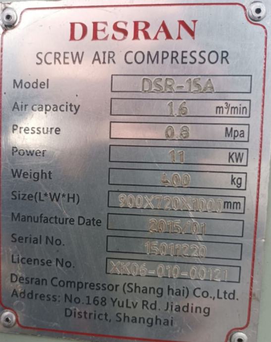 VIJČANI KOMPRESOR DESRAN DSR-15A - 11kW RABLJENO - PRODAJA - NAJAM