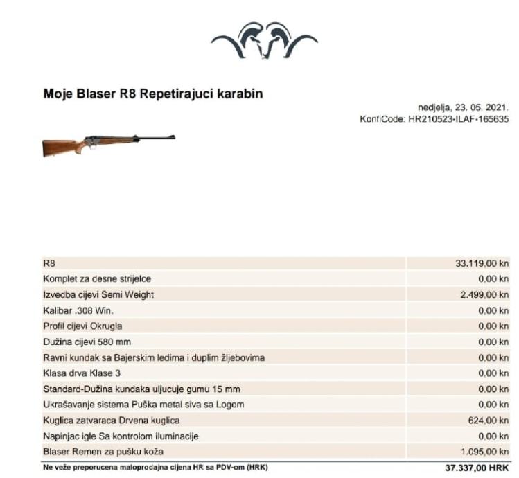 Na prodaju Blaser R8 u kalibru 308 win. Puska ima semi weight cijev bez nišana, dužine 580mm. Ispod pištoljskog rukohvata stavljena gravura. Uz pusku dolazi kožni remen plaćen 1000kn. Prodaje se bez nosača i optike. Bez zamijena. Cijena nove je 37 000kn, što se vidi na prilozenoj fotografiji.