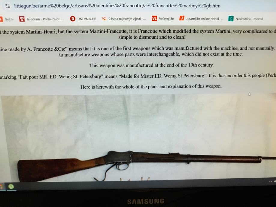 La Francote malokalibarska jednometka sistema Martini Henry prodajem. Puška je proizvedena krajem 19. stoljeća. Bila je to puška za dječake za lov na zečeve i ptice. U izvanrednom je stanju. Kolekcionarski primjerak. Potrebna nabavna dozvola. Preuzimanje u Osijeku.