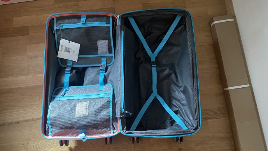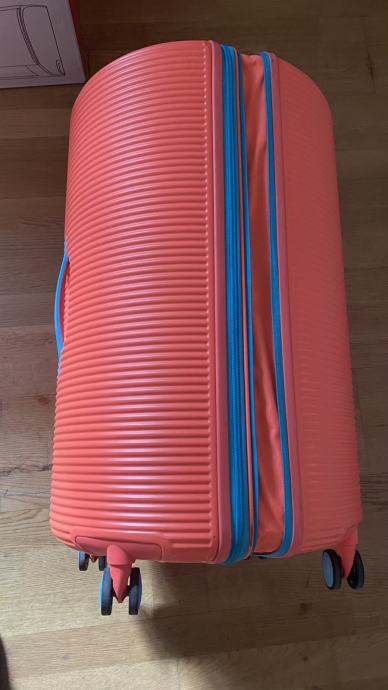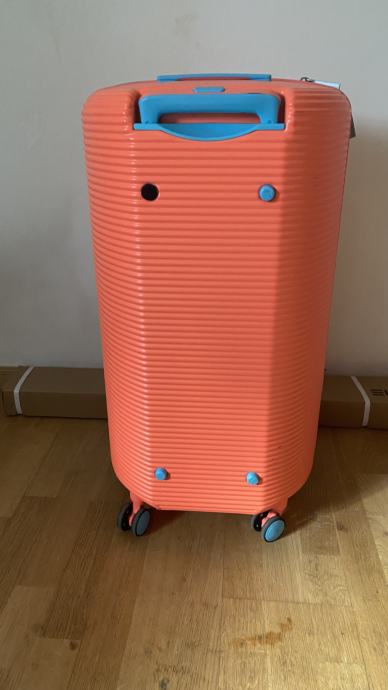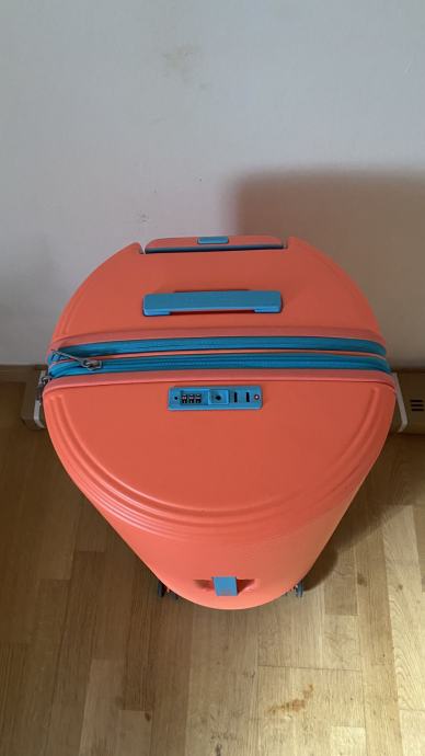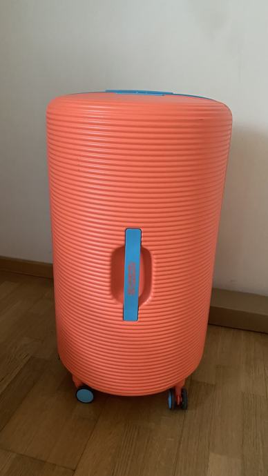 American tourister, prekrasan neobičan okrugli kofer, boje kričave breskve ;) Došao s greškom (vidljivo na slici) tj. sa stražnje strane ima 4 čepa a jedan je crni umjesto plavi. S vanjske strane ima par crtica, vidi se da nije skroz nov ali to je sve minimalno. Cijena je već prilagođena. Kofer se može proširiti za cca 5 cm.