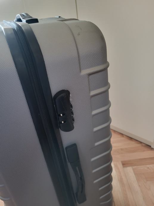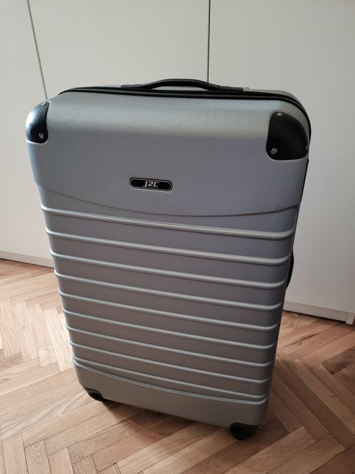 Prodajem putni kofer sive boje s tvrdim ABS kućištem i horizontalnim rebrima koja mu daju čvrstoću. Kofer je većeg formata, opremljen s četiri okretna kotačića, teleskopskom ručkom te dodatnom ručkom na gornjem dijelu. Sa strane se nalazi kombinirani lokot s troznamenkastom šifrom. Marka je J2C.Veliki kofer, samo jednom korišten, dimenzije 75 visina sa kotačima, 45-širina, 28- dubina.