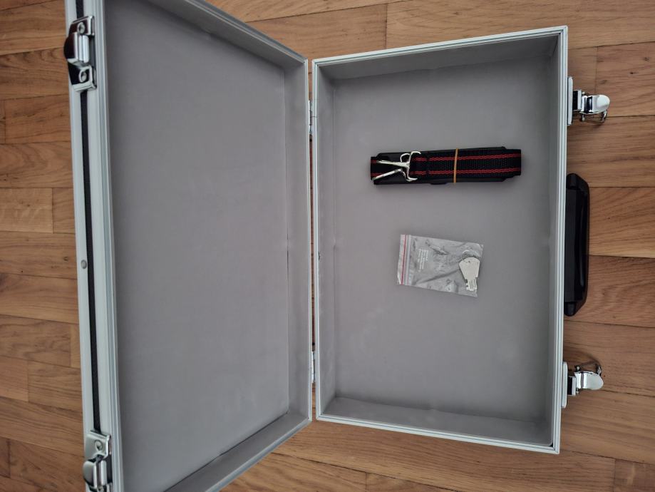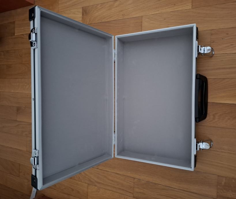 Potpuno nov,nekorišten,vrlo čvrst i lagan,tvrdo kućište, 2 ključa, remen za nošenje na ramenu,mekana gumena unutrašnjost pogodna za osjetljive predmete