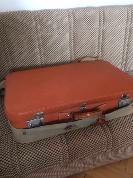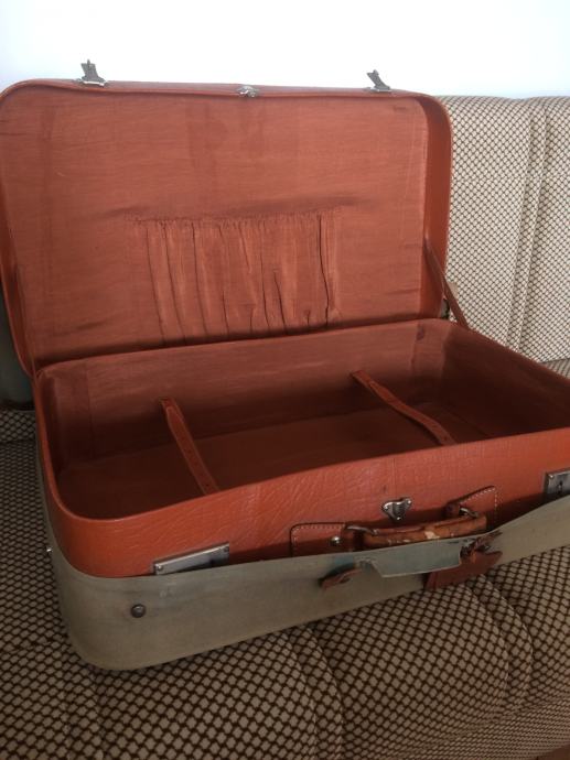 Maksimalno usčuvani stari kožnati kofer - kufer (još u platnenim zaštitnim navlakama, samo ručka manje oštećena-slika ) ,podstavljen, svijetlije smeđe boje, dim. 70x43x18. Stanje kao na slikama,