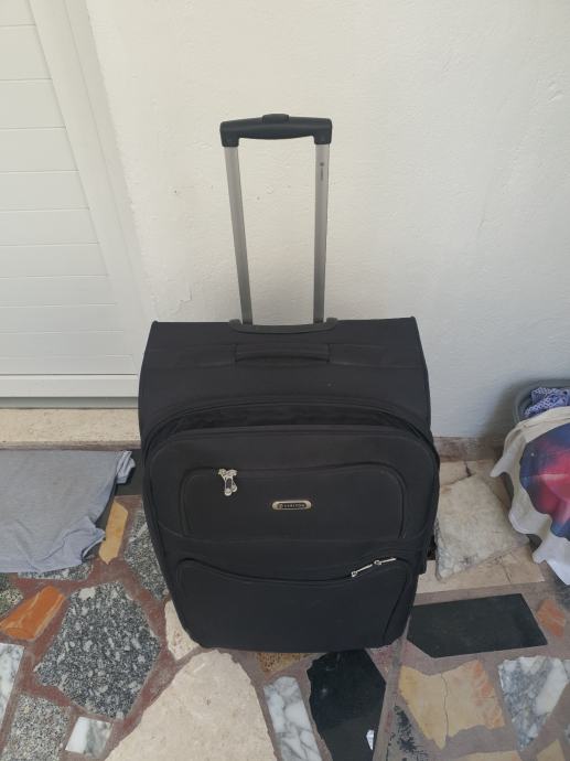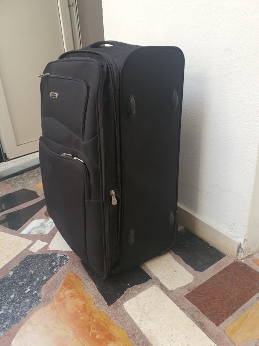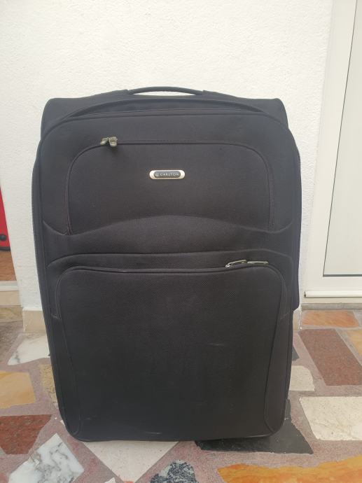 Prodajem putni kofer marke Carlton u crnoj boji. Radi se o velikom koferu mekanog tijela (softshell), izrađenom od čvrstog tekstilnog materijala. Kofer ima teleskopsku ručku za vuču, ručku za nošenje na vrhu te dva kotačića na dnu. Sprijeda se nalazi dodatni džep sa zatvaračem, što je praktično za stvari kojima trebate brži pristup. Zaključavanje je putem patentnih zatvarača.