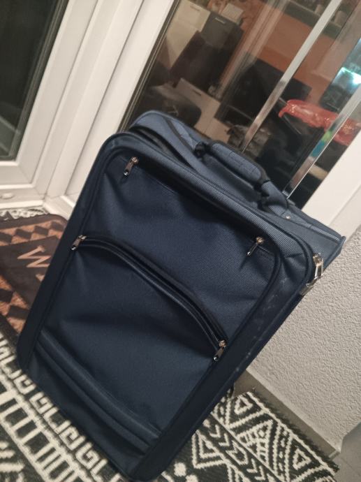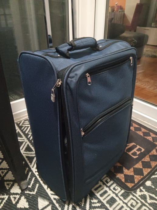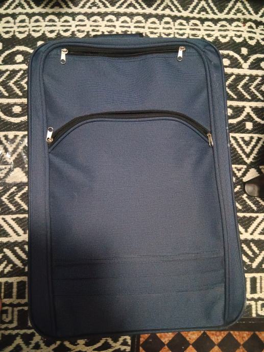 Prodajem putni kofer vece veličine u tamno plavoj boji. Kofer je izrađen od tekstilnog materijala i ima dva kotačića te izvlačeću ručku, što ga čini praktičnim za vuču. Na prednjoj strani nalazi se jedna veća zip džepa, a sa stražnje strane dodatna džepa za sitne stvari. Zatvara se patentnim zatvaračem s metalnim klizačima.Kofer je malo rabljen i u jako dobrom stanju je.