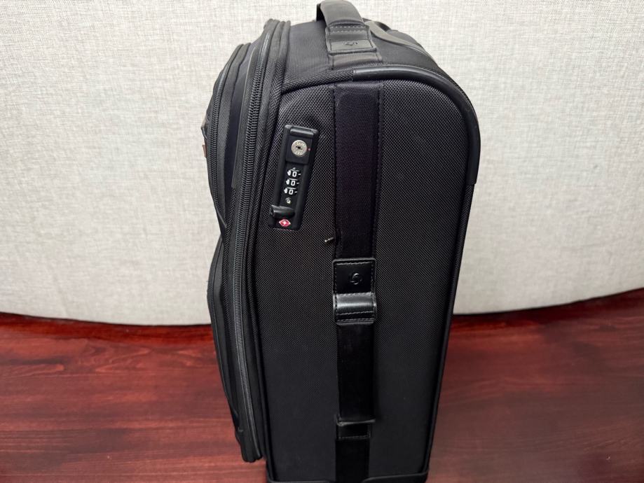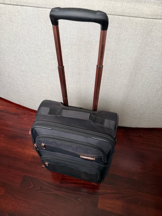 Prodajem Samsonite carry-on kofer na 4 kotača, u crnoj boji s elegantnim detaljima u boji ružičastog zlata. Kofer je carry-on veličine, prikladan za kabinu aviona, a zahvaljujući četiri okretna kotača lako se upravlja u svim smjerovima.